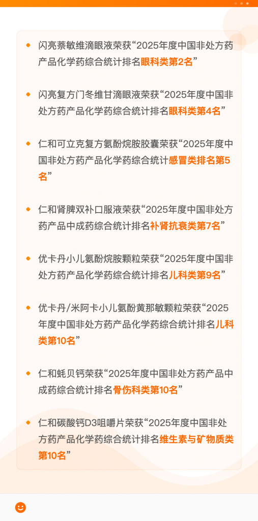 作為國內醫藥健康領域的領軍品牌,仁和始終堅守“藥品是立身之本”的核心發展理念。構建起覆蓋全場景健康需求的強大品牌集群:中國馳名商標“仁和”以“為人類健康服務”為初心,成為國民心中的健康信賴之選;中華老字號“藥都”承載百年醫藥文化傳承,詮釋傳統與現代融合的品牌魅力;此外婦炎潔、優卡丹、閃亮、仁和可立克等品牌在各自賽道穩居頭部,精準觸達不同人群的健康痛點,讓仁和深入生活的每一個健康場景。