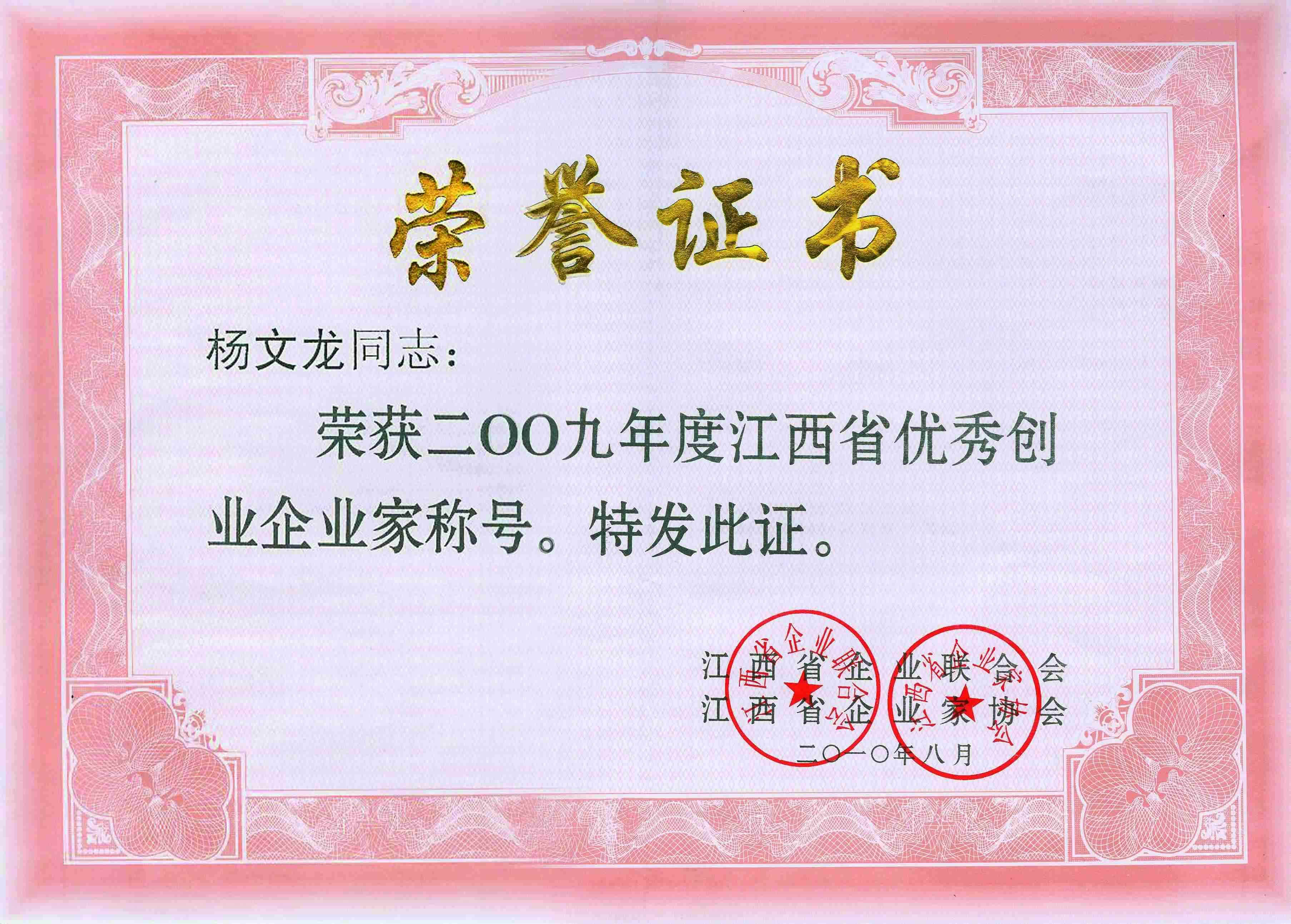 2009年度江西省優秀創業企業家稱號